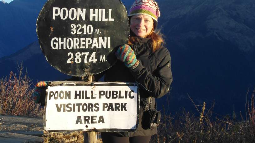 ’s Ochtends in alle vroegte ging ik op pad. Samen met de Nepalese gids en mijn reismaatje vertrok ik rond 05.00 uur vanaf onze guesthouse, in het bergdorp Ghorepani (2750 m), om de zonsopkomst mee te maken op de hoger gelegen bergtop Poon Hill (3250 m). De pittige wandeling nam een uur in beslag. In het donker je weg te vinden is best spannend, maar het lampje om mijn hoofd gaf verlichting. En wat bleek het de moeite waard! De zon kwam op en gaf een schitterende en kleurrijke voorstelling. Daar sta je dan, omringd door de met sneeuw bedekte bergtoppen van het Himalaya gebergte. Een magisch moment!