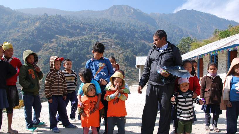 Ik kreeg de slappe lach met een Nepalees jongetje. Hoe ontwapenend, ik werd gelijk verliefd op dit smoezelige lachebekje. Ik keek hem zo lang als het kon na toen hij huppelend van geluk, met zijn te grote Nederlandse t-shirt als onbetaalbare schat, over het schoolplein rende.