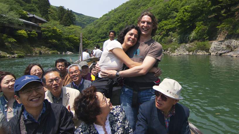 Op een boot met vlakke bodem, drie bootvaarders met grote, stevige roeispanen en bamboestok begin ik vol spanning aan onze boottocht in Japan. Eén bootvaarder staat achter het roer, de andere twee beheersen de roeispanen. We zakken de Hozu rivier af.