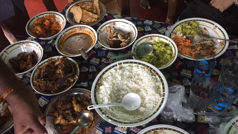 We eten bij een lokale familie thuis. Een heerlijke lunch met veel vis en de beroemde krab. Het is weer heerlijk! Ondertussen blijft het ook vandaag regenen en zelfs onweren. Geen goed vooruitzicht voor de bootreis terug. We nemen de eerste boot van 14.30 uur en we zijn blij als we weer op het vaste land staan.
