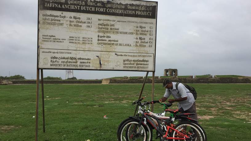 Na de lunch is het tijd voor een fietstocht. Net als we op de fiets willen stappen begint het te regen. Het is geen kleine bui maar een hoosbui die de rest van de fietstocht aanhoudt. Erg jammer want Jaffna heeft mooie en interessante bezienswaardigheden. Gelukkig houden we de lol er in en lachen we heel wat af tijdens het fietsen. We geven de hoop maar op dat er ook maar iets droog blijft. Een bijzondere stop is bij de Nallur Kandaswany tempel. De grootste Hindu tempel van noord Sri Lanka. We wonen het gebed bij en stappen daarna weer op de fiets. Nog snel even kijken bij het Nederlandse fort en dan zit de tour erop. Al met al hebben we bijna drie uur (door de regen) gefietst.